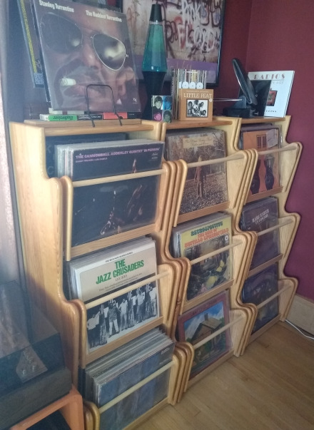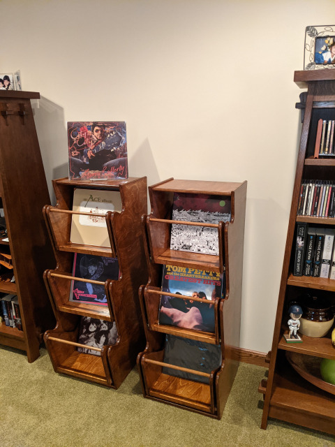 To the left are two GrooveKeepers belonging to Bruce. His stain work has his two GrooveKeepers matching his existing shelving and looking very regal!! Great job Bruce!!